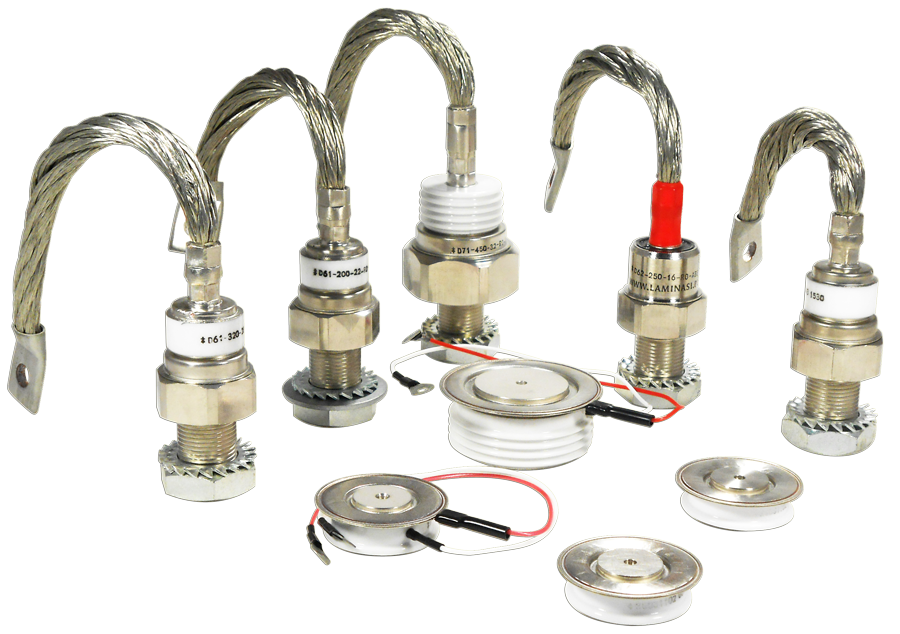 And many other formats as stud type thyristors and diodes for medium power applications in American and European screw. Press-fit button diodes for welding, automotive and battery charge applications, etc. With the capacity to make customized and special assemblies.